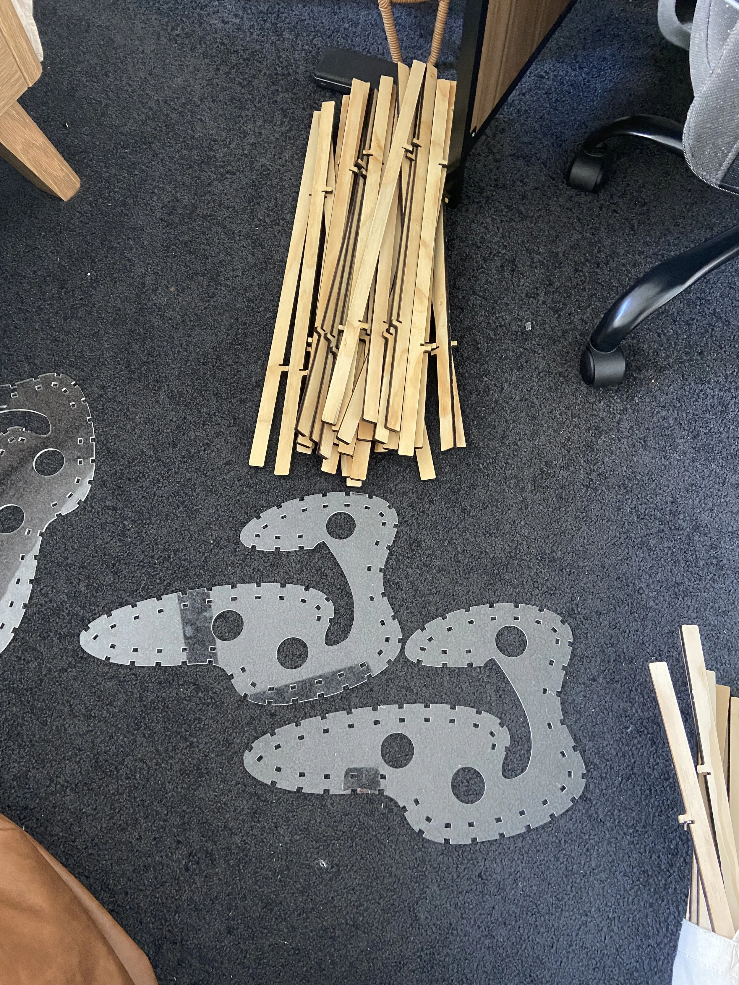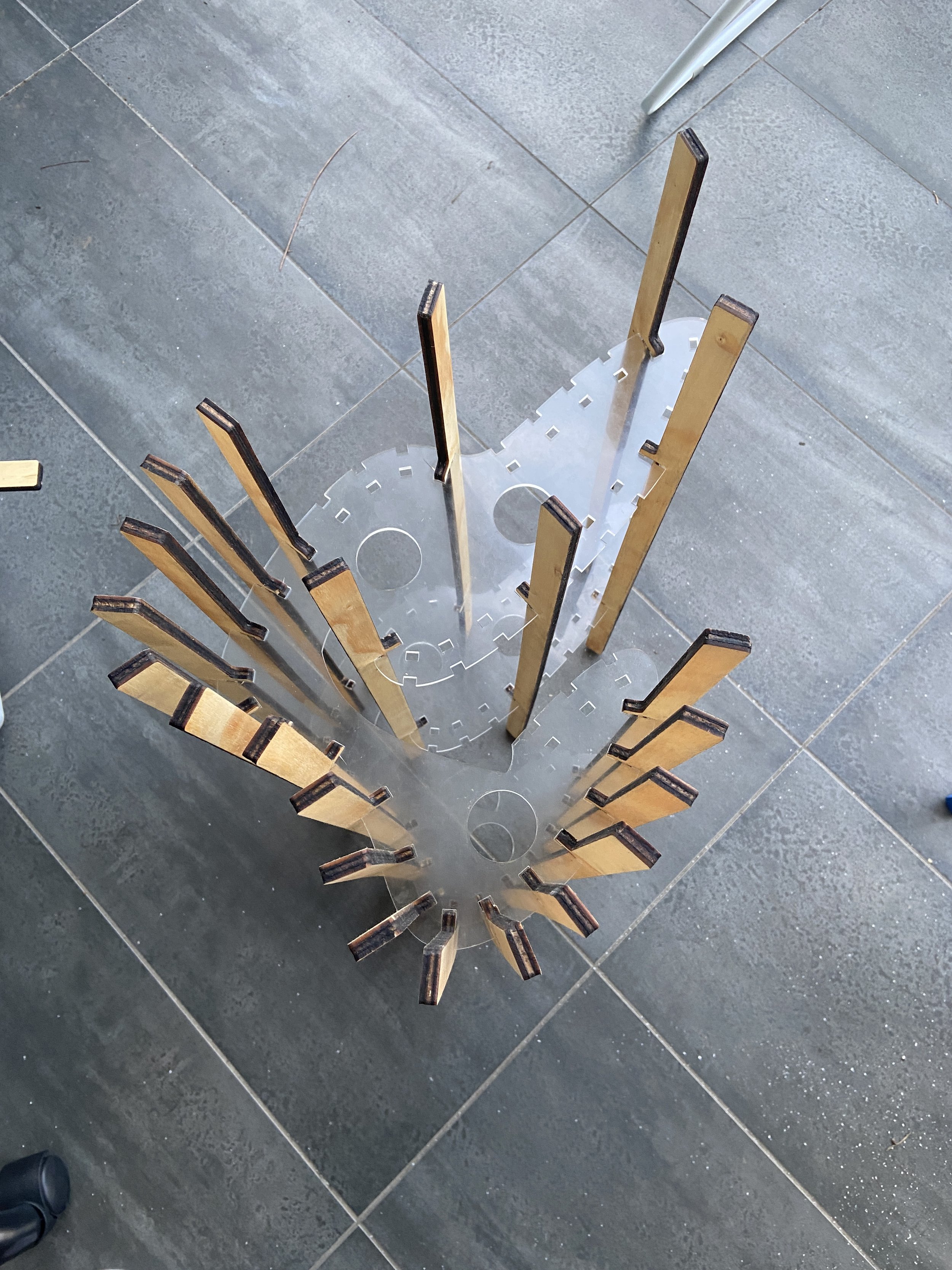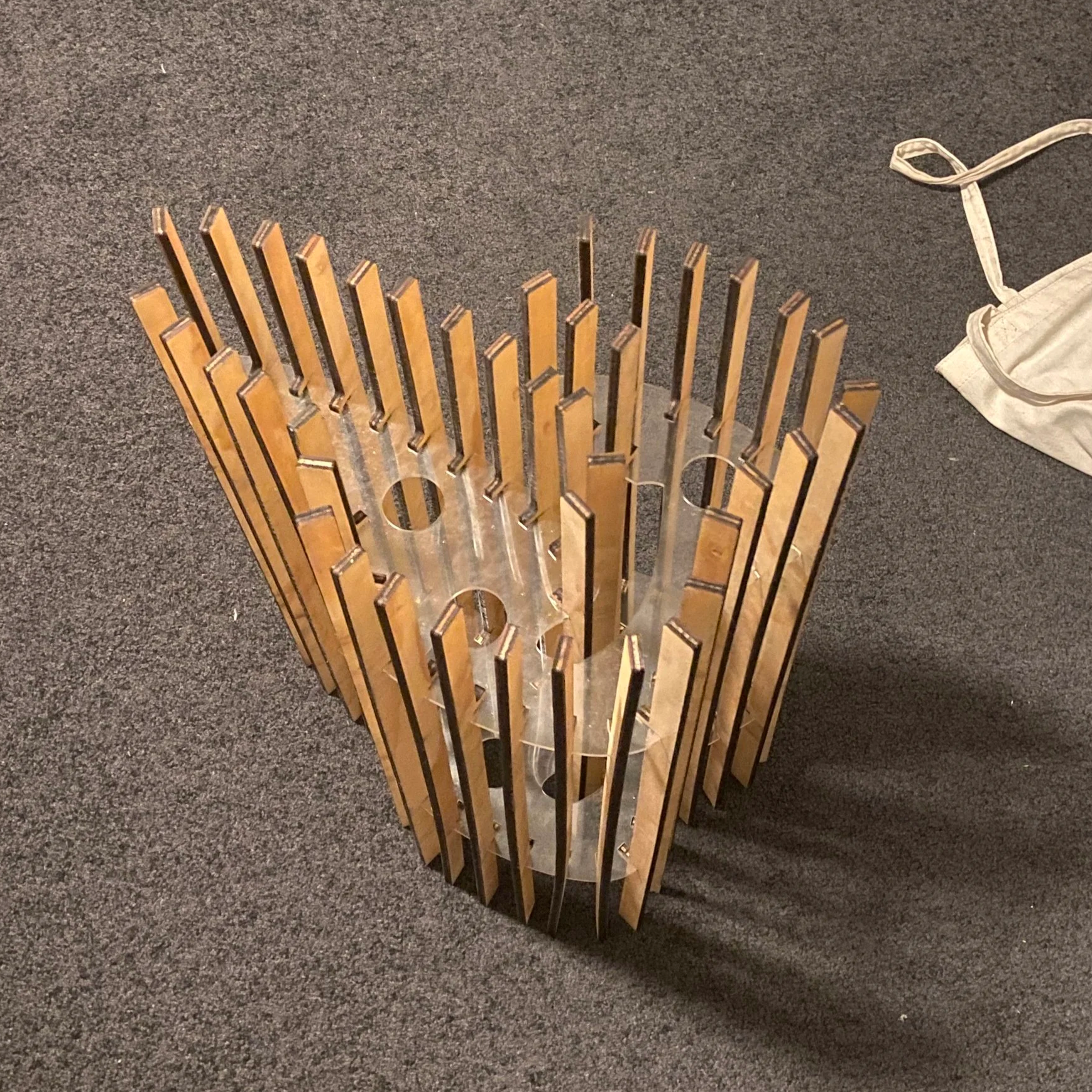Lightburn was used for the laser cutting process. The wooden slats were cut from 7mm plywood and the acrylic plate from 3mm clear acrylic. The total cutting time for these pieces was 1 hour and 30 minutes.