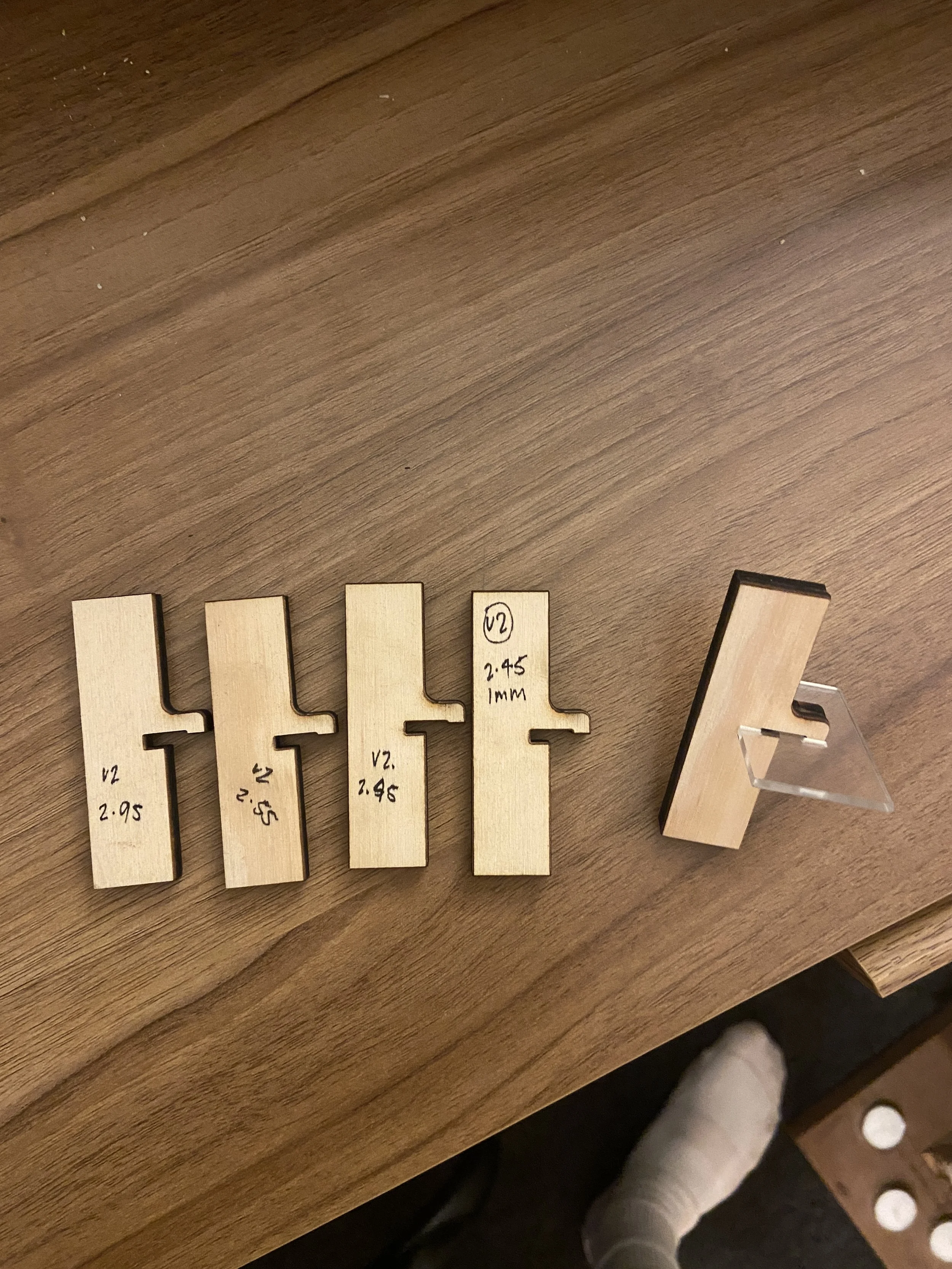 Before cutting the pieces, I created tests of the clip mechanism to account for the tolerance of the machine which was found to be +0.25mm.