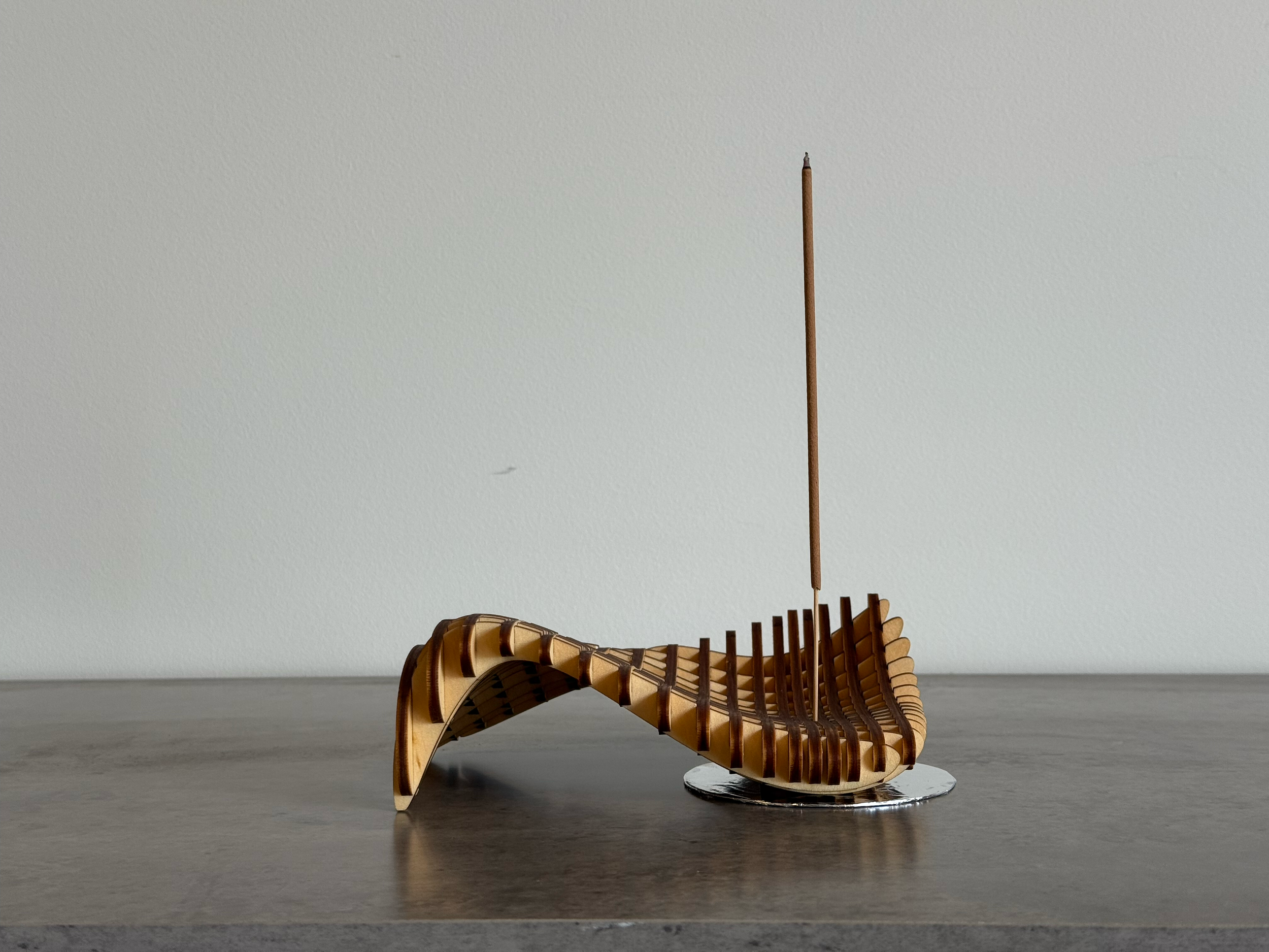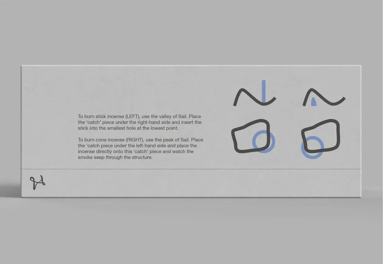 The structure accommodates two forms of incense, stick and cone. To burn stick incense, the user simply places the ‘catch’ piece under the right hand side of the structure where it converges to a 1mm² hole here the incense stick can be placed to stand upright.